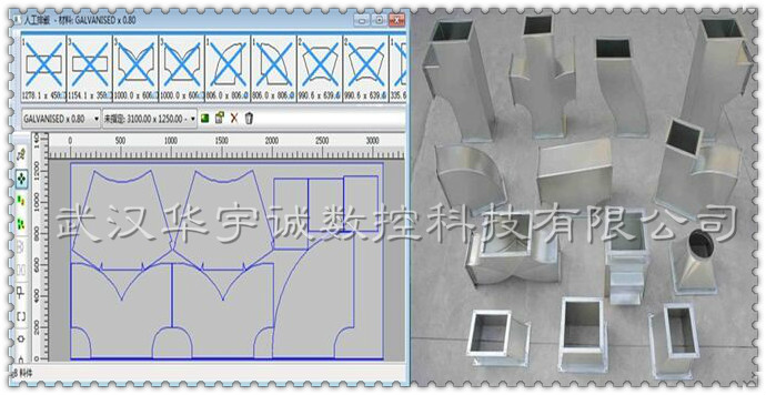 加工范圍:0.2-6.0mm任意材料鋼板的切割成型!可切割各種異形件,電腦直接畫圖,導出加工程序,批量高速切割,效果好,精度高,不掛渣!配合專用的風管展開軟件,自動生成圖紙、導出加工程序。操作人員所需要做的就是在軟件中選擇所需要的風管樣式,輸入所需要的尺寸,然后調出加工程序進行切割就可以了。既方便快捷、又精確實用。